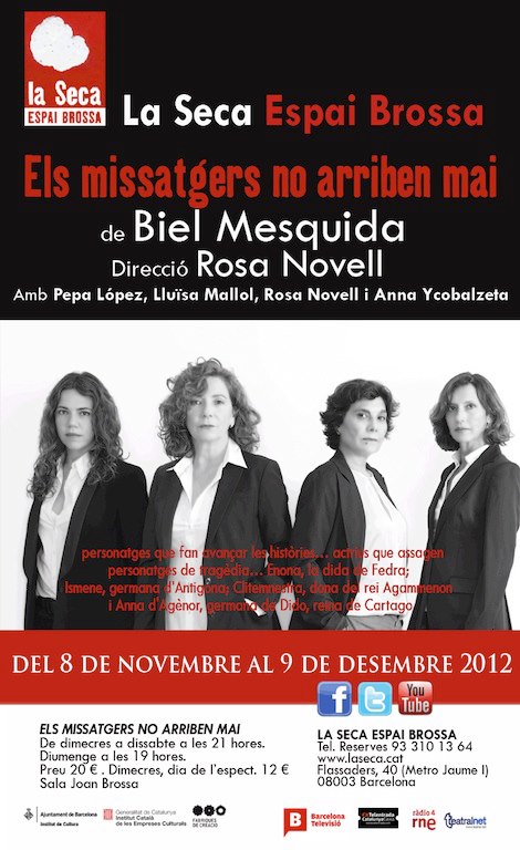“Els missatgers no arriben mai”, sobre la seva estrena teatral la premsa n’ha dit: He ahí un tríptico brillante, lleno de agudezas psicológicas, dotado de una calidad incuestionable. JOAN-ANTON BENACH, La Vanguardia No hay que escatimar un último aplauso para el autor Biel Mesquida que nos hace el favor de recordar que nuestras pequeñas tragedias ya fueron dibujadas hace años en la Grecia Clásica. MARTÍ FIGUERAS MARTÍNEZ, másteatro Tres solos sense trampa ni fissures que completen un muntatge idoni sobretot per a espectadors convençuts de la proposta, potser fins i tot millor si aquests són, ni que sigui lleugerament, coneixedors dels clàssics, però també idoni per a espectadors amb curiositat per constatar com es fa el relleu entre un espai d’assaig a un espai de representació teatral i com es reconverteixen tres actrius que arriben a la sala al mateix temps que els espectadors en tres personatges de ficció. Una lliçó teatral de gran força per a tots els gustos. ANDREU SOTORRA, Clip de teatre